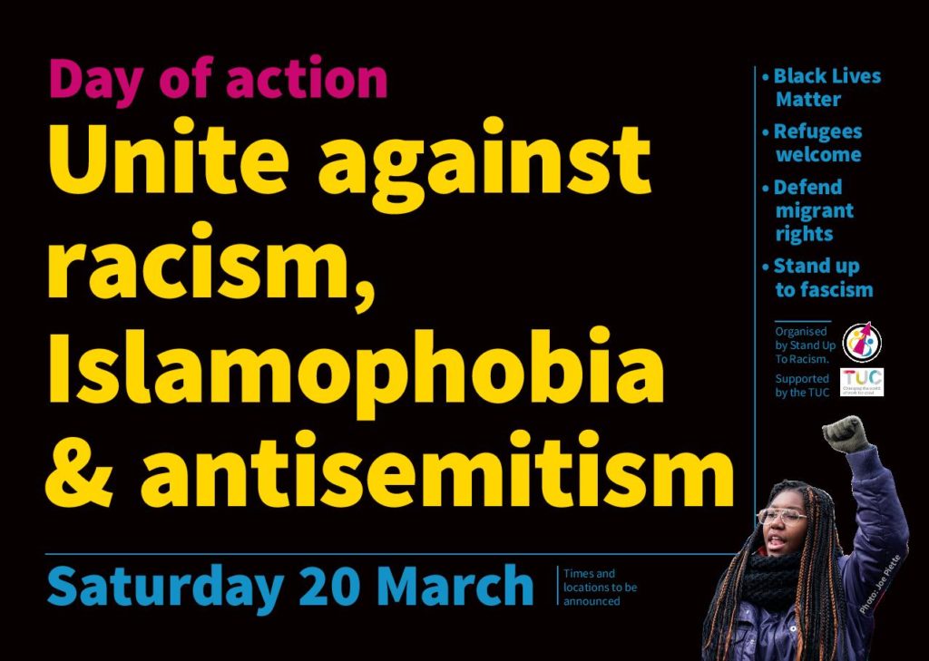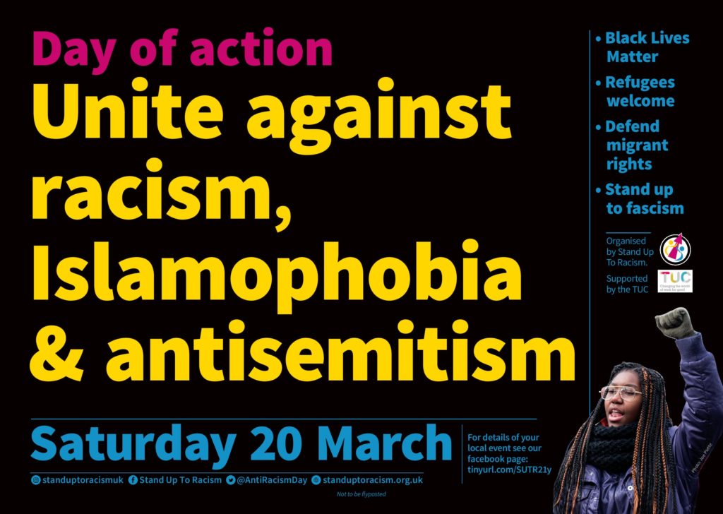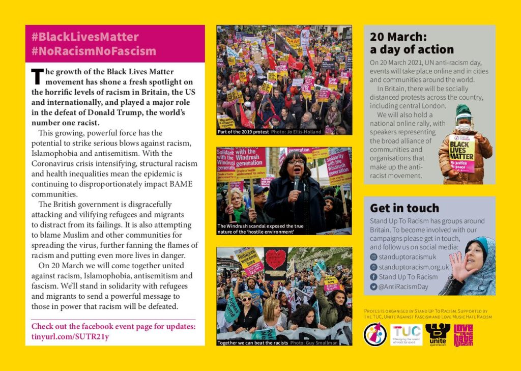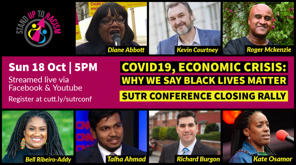 1. Stand Up To Racism International Conference (online) on Sat 17 & Sun 18 October – ‘Black Lives Matter – No to Trump & Johnson’s Racist Offensive’ with speakers from the UK, US & across the world.
