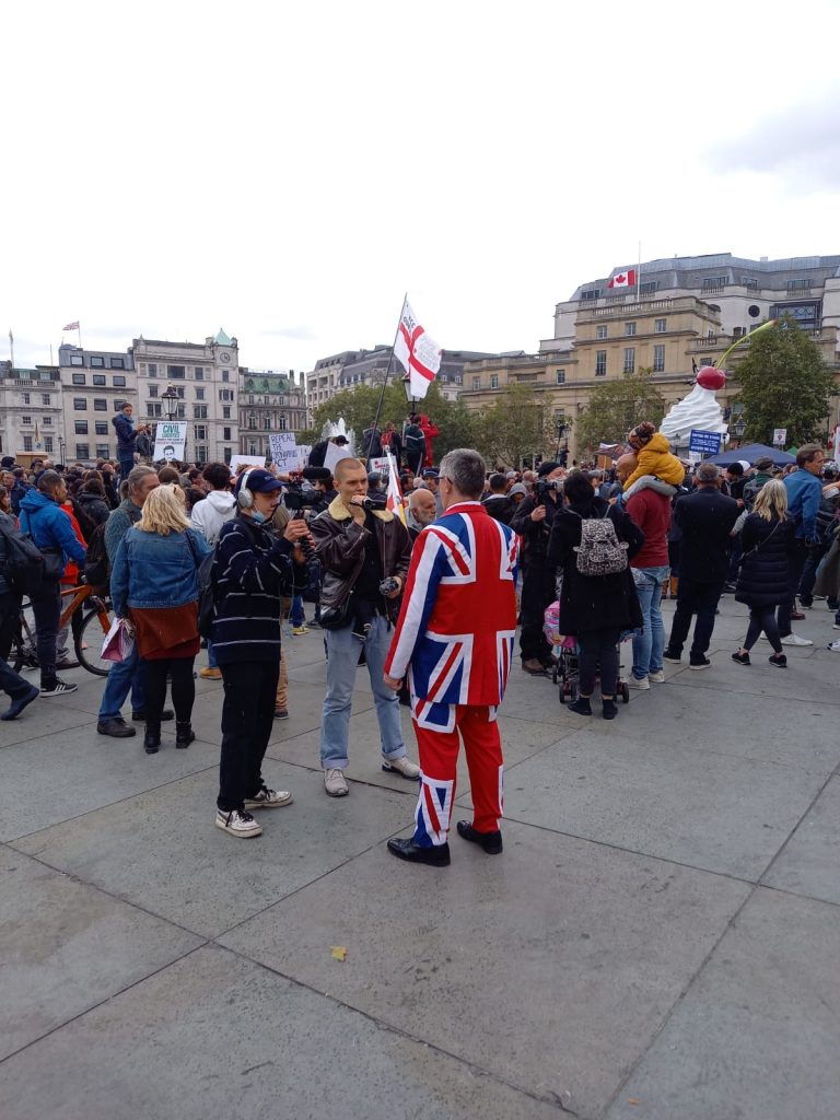 Anyone attending these events has to ask themselves if they feel comfortable sharing the square with the likes of David Icke or ex members of English Defence League (EDL), British National Party (BNP) or the present day Democratic Football Lads Alliance (DFLA) thugs who were in the crowd. Known fascists have operated on these protests without challenge. Fascist flags have been displayed and nobody has attempted to remove them.