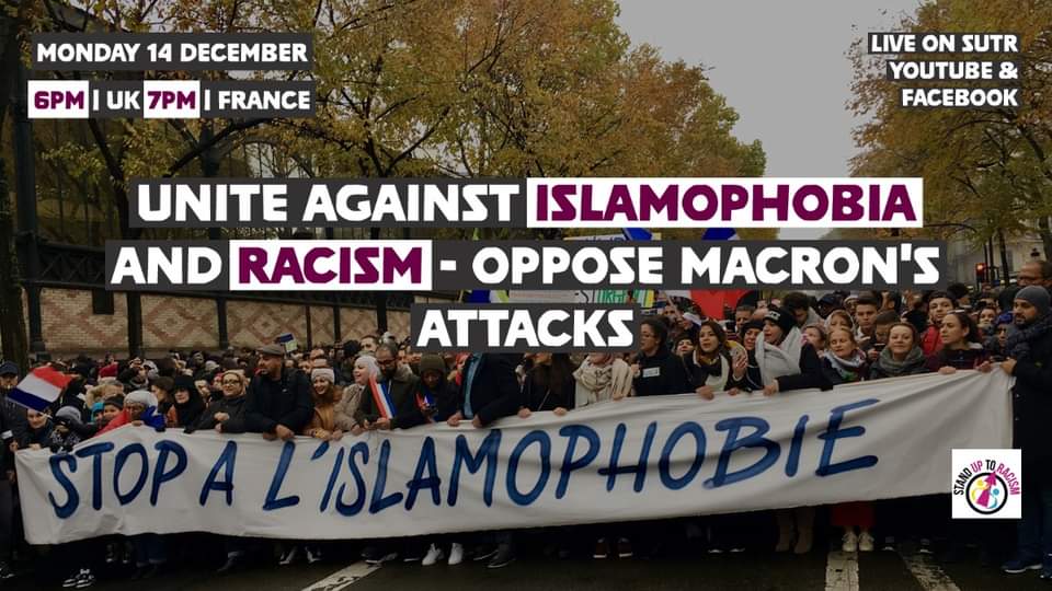 | CLICK HERE TO JOIN THE FACEBOOK EVENT PAGE Event will be streamed live: https://www.facebook.com/StandUTR/live https://www.youtube.com/c/StandUpToRacismChannel/live Date: Monday 14 December 2020 Time: 6pm Speakers include: • Diane Abbott MP • Marwan Muhammad, CCIF ( France) • Bell Ribeiro-Addy MP • Dilowar Khan, London Muslim Centre • Mohammed Kozbar, Finsbury Park Mosque • Aman Ali, MEND • Maz Saleem, anti-racist campaigner and daughter of Mohammed Saleem • Sabby Dhalu, co-convenor Stand Up To Racism • Weyman Bennett, co-convenor Stand Up To Racism French President Emmanuel Macron has launched a major onslaught against Muslims – talking up ‘foreign influence.’ This included repression of organisations such as the Collective Against Islamophobia in France, the expulsion of over 200 Muslims and forcing the French Council of the Muslim faith to create a national council of Imams under government supervision – with the power to withdraw accreditation. Macron’s Islamophobia is encouraging Marine Le Pen and the fascist National Rally to increase their attacks – they are calling for the government to crack down even harder on the Muslim community and a ban on the Hijab. Thousands have fought back and mobilised to protest against police brutality on black communities and the removal of refugees. The Islamophobia of mainstream politicians opens the door to the far right. We have to come together, unite to oppose the scapegoating of Muslim communities and oppose the rise of Islamophobia and racism. |