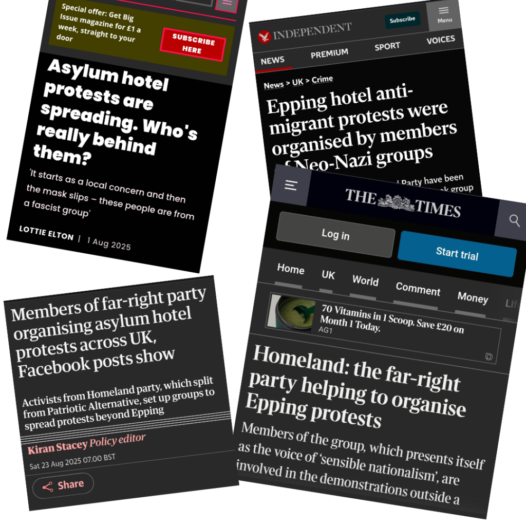 Image: National press coverage in late July/early August of Homeland Party’s links to organising protests in Epping.