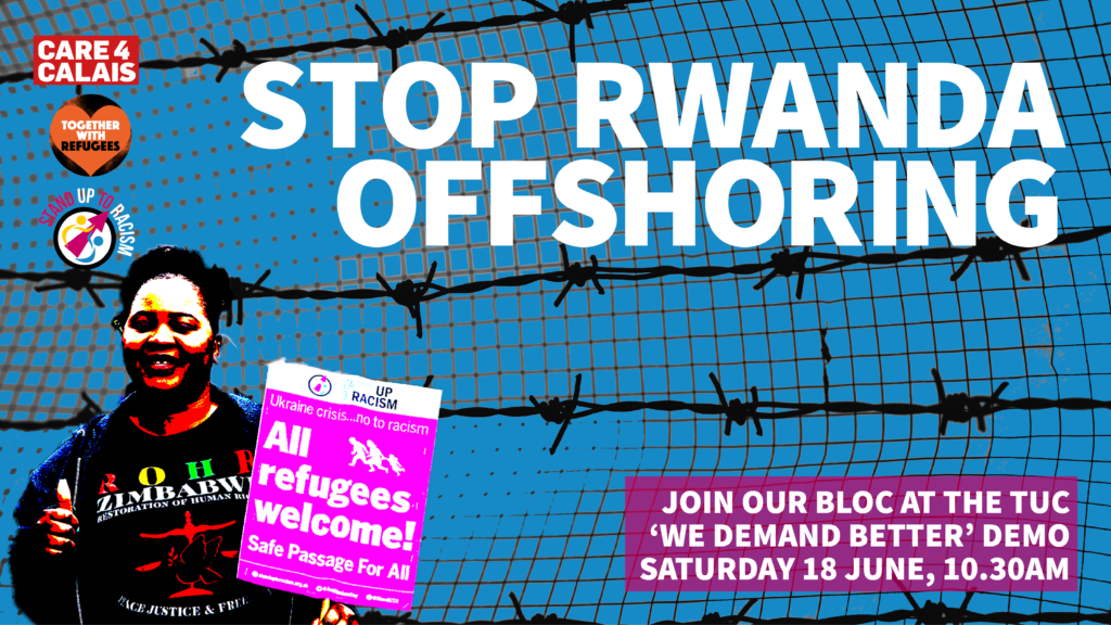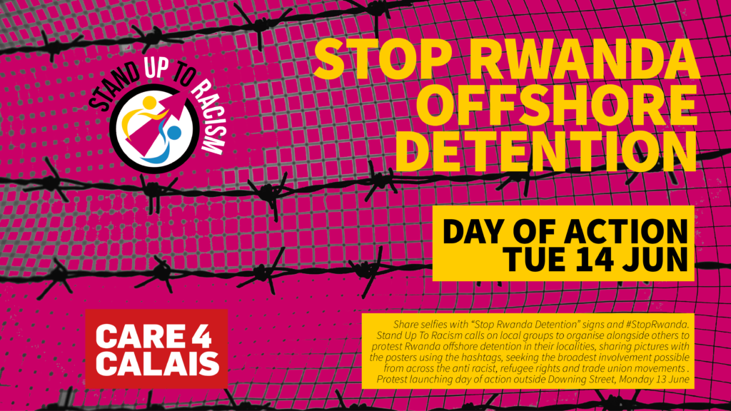 ![]() Stand Up To Racism and Care4Calais will join a mass protest at the Home Office tonight, ahead of tomorrow’s day of action to oppose Rwanda offshore detention 📣 TODAY! MONDAY 13 JUNE 5.30pm outside the Home Office Marsham Street, London SW1P 4DF Stand Up To Racism and Care4Calais will protest alongside others tonight, Monday 13 June, outside the Home Office, against the widely condemned government plans for offshore detention in Rwanda. Tomorrow, Tuesday 14 June, Stand Up To Racism and Care4Calais have called a Britain-wide Day of Action to stop Rwanda offshore detention. See the list of planned protests HERE It was fantastic to see to protests at Brook detention centre at Gatwick yesterday, and to see the incredible response in Peckham, where a year on from Kenmure Street, and a month on from similar mass actions in Edinburgh and Hackney, a Home Office immigration raid was stopped by mass united action in the community – protesters refused to let their neighbours be taken. The High Court decision on Care4Calais and PCS legal team’s appeal, following their submission of an injunction to stop the flight last Friday, is due at 3.30pm today. We need to keep mobilising, Stand Up To Racism sends its solidarity to all protesting and to the many who are organising demonstrations. Tonight we will join all those at the Home Office, and tomorrow across the country as part of the joint day of action with Care4Calais, protests will be taking place. Email [email protected] to find your nearest of you can’t see one here On the eve of the first planned flight, the PCS union and Care4Calais legal team are in court appealing the result of their submission for an injunction last Friday to stop the flight going ahead. Care4Calais has reported earlier, “Another Rwanda deportee has had his ticket cancelled. “Twenty-one people have now had their Rwanda tickets cancelled, but ten still have live tickets for tomorrow.” Protests took place at the Brook detention centre near Gatwick yesterday, Sunday 12 June, and followed another mass protest that stopped an immigration raid, in Peckham, London on Satutday 11 June. This mass action echoed what happened last month in Hackney, and in Edinburgh’s Nicolson Square, and come a year on from the events on Kenmure Street in Glasgow’s Pollokshields. Care4Calais and Stand Up To Racism are also organising a major bloc on the TUC’s upcoming ‘We demand better’ protest in London on Saturday 18 June. Stand Up To Racism is also organising a series of regional and local rallies, From Offshore Detention to the Nationality and Borders Act, End the Hostile Environment – #AllRefugeesWelcome These mobilising rallies are lined up around Refugee Week in June, to scrap the borders act, oppose offshore detention in Rwanda, and organise networks in localities that can challenge the hostile environment, and stop detention raids when the Home Office attempts to inflict these attacks on our neighbours: Leeds rally, Tue 14 June, 7pm York rally, Fri 17 June, 7pm Glasgow rally, Mon 20 June, 7pm Sheffield rally, Wed 22 June, 7pm Birmingham rally, Thu 23 June, |