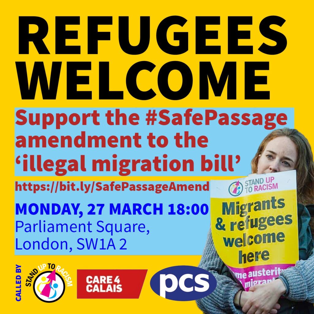 | ShareTweetForward Press Release… for immediate release… Care4Calais, PCS union & Stand Up To Racism to protest ‘Illegal Migration Bill’ at Parliament- 6pm tonight, Monday 27 March, demanding safe passage See event page: https://fb.me/e/L1lzfyO3 Full details and publicity: https://standuptoracism.org.uk/protest-mon-27-march-6pm-parliament-square/ Today, Monday, 27 March, the #IllegalMigrationBill – described h anti racists as “Sunak and Braverman’s latest brutal attack on the human rights of refugees” – is to be discussed in committee stage parliament, with amendments. Care4Calais & Stand Up To Racism have called a protest, 6pm on Monday at Parliament Square, alongside the PCS civil service workers’ union which has led opposition to the government’s border policies, and the People’s Assembly Against Austerity. The protest organisers are calling on people to join them opposing the bill, and supporting an amendment for a safe passage visa scheme that would enable those exercising their internationally and legally recognised human right to seek asylum to travel safely to Britain in order to persue their asylum claim. Speakers at the protest include a number of MPs such as Jeremy Corbyn, Bell Ribeiro-Addy, Richard Burgon and Beth Winter, alongside refugees, Care4Calais, PCS union and Stand Up To Racism, as well as representatives of trade unions, faith groups and campaigns. The protest will assemble 6pm in Parliament Square on Monday 27 March. The weekend saw anti racist and anti fascist counter mobilisations, organised by Stand Up To Racism, outnumber far right and fascist protests in Erskine, Wakefield, Manchester, Wallasey, Llantwit, Honor Oak and Newquay. Fascists and the far right are targeting refugees and LGBT+ people, whipping up racism and bigotry. Anti racists say that they are doing so in an effort to divide people, and to build their “vile and nasty organisations based on the politics of hate“. Organisers of tonight’s vigil argue: “While fascist organisation in Britain is extremely weak at present, we can see from across Europe and the US how these forces can grow at a time of crisis amidst despair. “History has shown us the danger if we don’t counter these forces, and stamp them out before they can grow to become a real threat. The far right and fascists are been fed oxygen to grow from the racist, dog whistle and scapegoating politics of this government. “We must counter every attempt by the far right to organise, and we must also take on the racist offensive they are pushing. “That’s why Stand Up To Racism, Care4Calais, trade unions and others have been mobilising alongside others around Britain to counter and outnumber protests by far right and fascist elements. And that’s why we are calling on everyone who can to join us outside parliament, 6pm tonight, Monday 27 March to oppose the #IllegalMigrationBill and support the #SafePassage amendment”. Weyman Bennett, Stand Up To Racism co convenor, added: “The government’s new bill is yet another vicious assault on the rights of refugees and is about whipping up racist division to scapegoat refugees and migrants. “It is part of the racist rhetoric and policies that gives confidence to and fans the flames of the far right and fascist forces, who are actively organising in an attempt to build a racist movement against refugees.” Stand Up To Racism and Care4Calais, alongside trade unions and the wider movement, have pledged to continue to oppose the far right attempts to target refugees wherever they do so. Care4Calais, PCS and Stand Up To Racism have been part of arguing the importance of countering the far right and mobilising against them to send a clear message that racism must be actively opposed. Care4Calais, Stand Up To Racism and PCS also call on all anti-racists to support the Safe Passage policy developed by Care4Calais and the PCS union and supported by Stand Up To Racism, FBU, NEU unions and oothers. The amendment that will be debated at parliament on Monday has gained the support now of 21 trade unions. Organisers call on everyone opposed to this bill to join us in Parliament Square, tonight, Monday 27 March as the bill goes to Parliament, to say loud and clear that refugees are welcome. We call on everyone to lobby in support of the amendment demanding safe passage visas and oppose the #IllegalMigrationBill. See amendment (page16-17) here: https://publications.parliament.uk/pa/bills/cbill/58-03/0262/amend/illegal_migration_cwh_rm_0321.pdf See Safe Passage Visas policy document here: https://care4calais.org/safepassage/ To arrange further quotes and interviews: [email protected] |