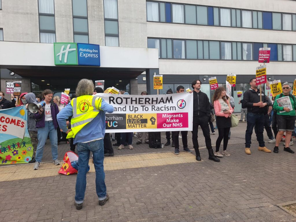150-plus anti-fascists outside a hotel in accommodating refugees in Manvers