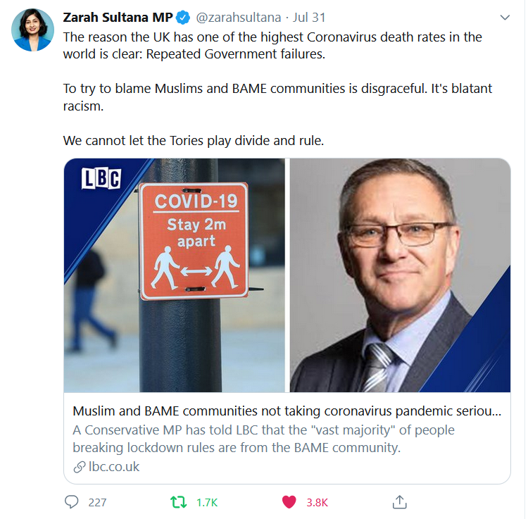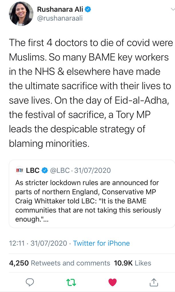The offensive comments were made as Muslims were celebrating Eid-Al-Adha. On the same day the government imposed a series of local lockdowns in Greater Manchester and parts of Lancashire and West Yorkshire and retreated from further easing the lockdown as planned, giving only three hours notice.