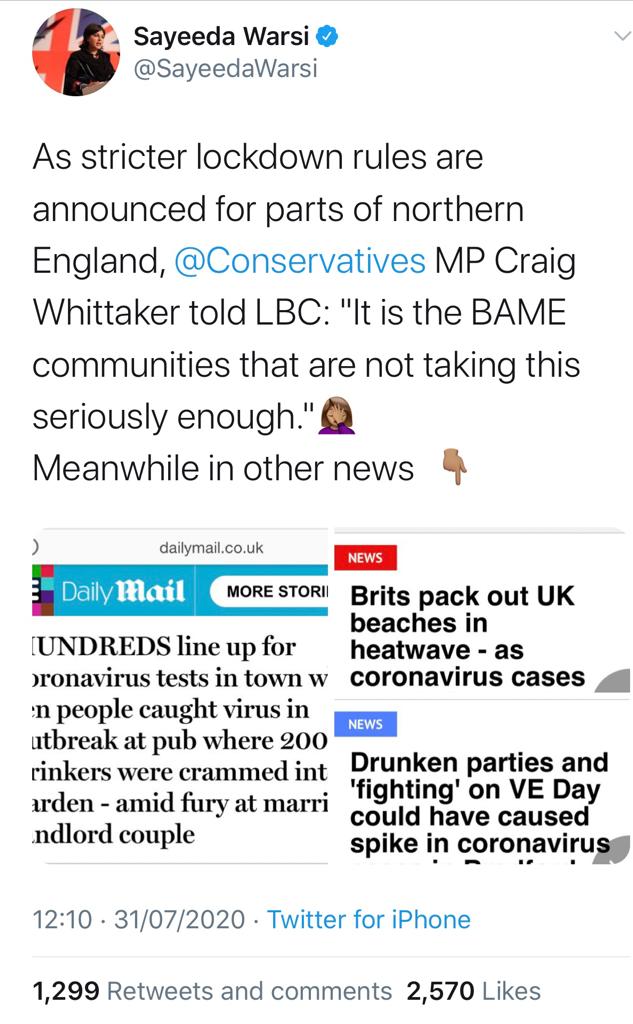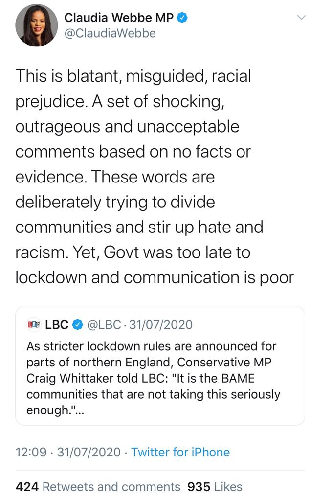 During an interview with LBC radio, Whittaker suggested that Black Asian and Minority Ethnic (BAME) and Muslim communities were not taking the coronavirus pandemic seriously and alleged that Covid cases were increasing in areas with BAME communities. These outrageous, racist and Islamophobic comments have no factual basis.