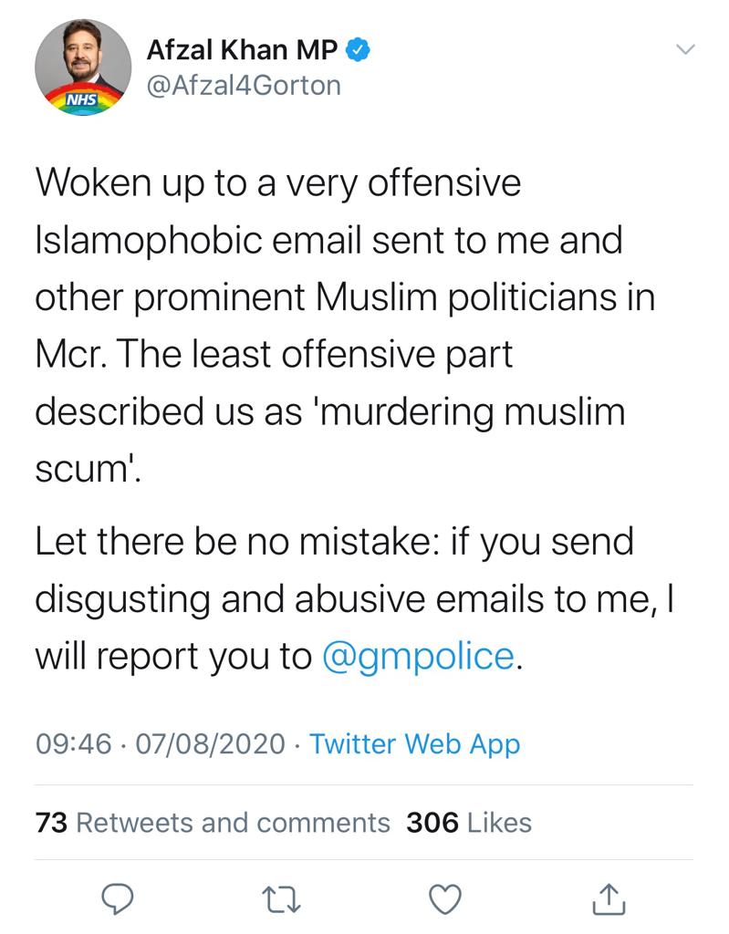 Reports on hate crime suggest a link between racism from politicians and media coverage, and racist hate crime on the ground. Online Islamophobic abuse increased by 40 per cent during lockdown, from last year. Gorton MP Afzal Khan tweeted that he and other prominent Muslims in Manchester received Islamophobic and abusive mail. In Leicester, according to the police there were 208 racially aggravated incidents in July, up from 156 in 2019.