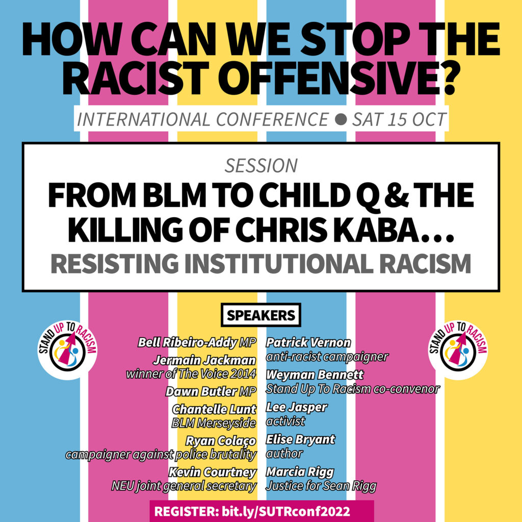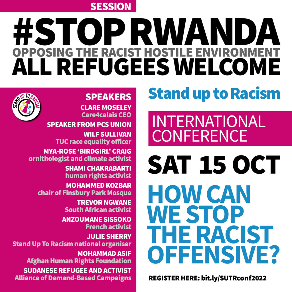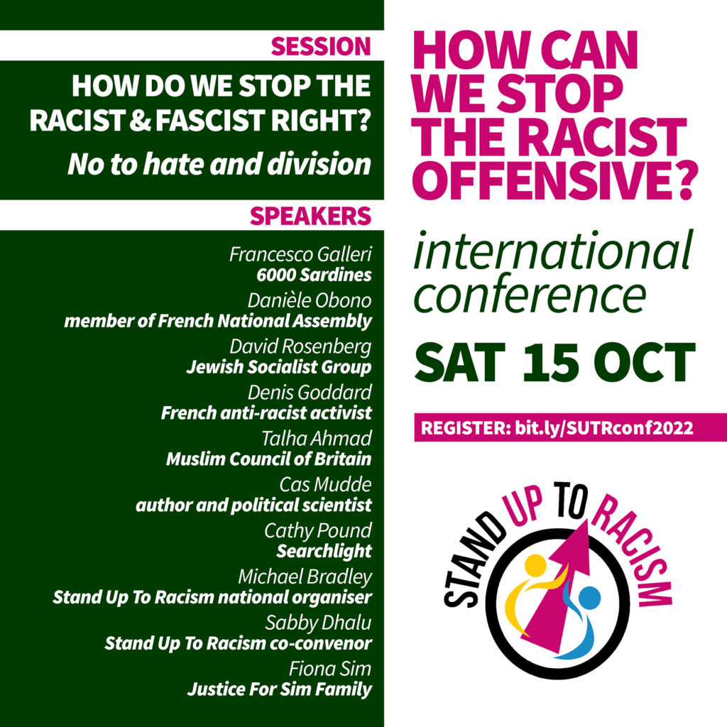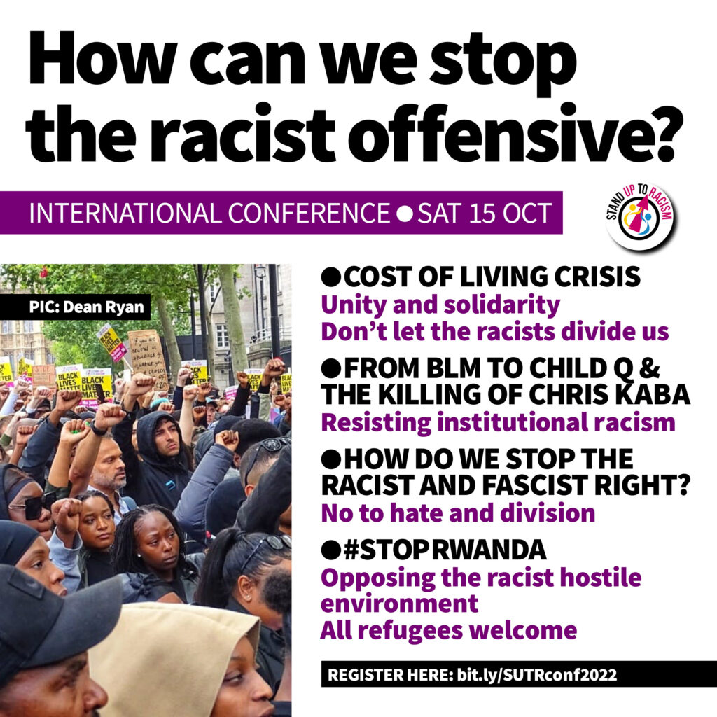 BOOK YOUR PLACE NOW Our international conference on Saturday 15 October is now under two weeks away, with hundreds already booked up. It comes at a very important moment. As a government in crisis with a fresh prime minister seeks to ride out resistance to the cost of living crisis attacks and unions are coordinating strikes, it is clear that Truss and the newly appointed Home secretary Braverman will push ahead with intensifying the racist hostile environment. In recent weeks we have had mass protest again across Britain, and with 600 outside the court, on the opening day of the hearing against the heinous Rwanda offshore detention policy. We have seen mass protests erupting over the police killing of Chris Kaba, an unarmed 24 year old black man in south London. In the wake of the Black Lives Matter movement, there is clearly the urgent need, and capacity, for mass resistance to institutional racism rife in Britain. Whether institutional racism and police violence or racist pushbacks and Borders policies – these issues are both international, and also have a direct relationship to the action being organised by unions against impact the cost of living crisis. The conference will not only draw together activists and campaigners and the experience of the anti racist and anti fascist movements across the world, but it will also discuss how we can ensure that we don’t let them divide us, that our movement organises to challenge the politics of divide and rule. The conference will run (10am registration) 11am to 5pm, with four consecutive running social forum style sessions… |