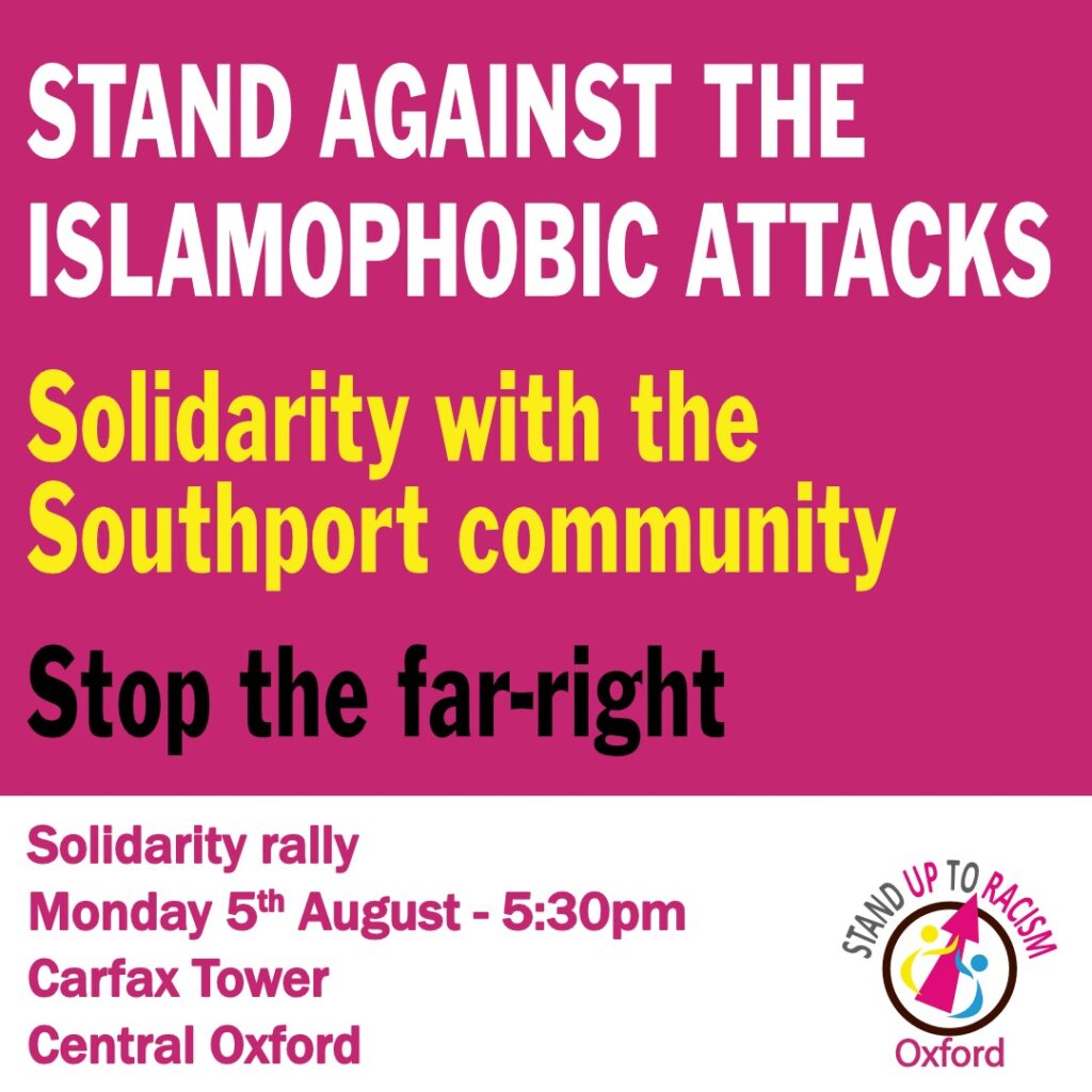 👆Oxford, Monday 5 Augus,: 5:30pm – Stand Against the Islamophobic Attacks, Carfax Tower, Central Oxford