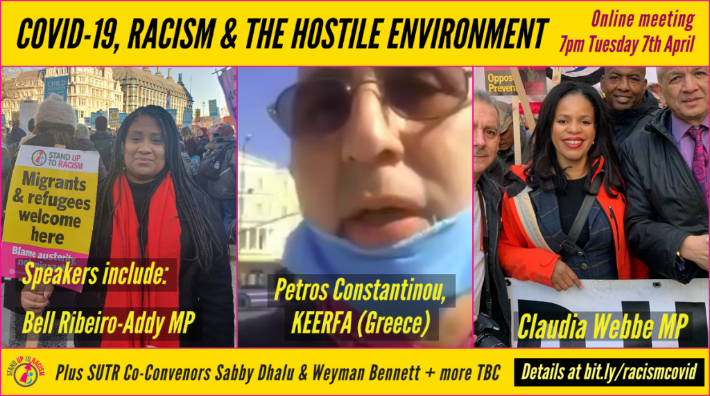 | With Bell Ribeiro-Addy MP, Claudia Webbe MP, Petros Constantinou, KEERFA (Greece), Stand Up To Racism co-convenors Sabby Dhalu & Weyman Bennett, an NHS paramedic + more speakers TBC The Covid-19 Pandemic, combined with the failure of the British Government to properly protect its population, and a major economic crash has created situation where the most abhorrent forms of racism are set to thrive. Racist attacks against Chinese and east-Asian people are on the rise, and anti-immigrant measures have meant that migrants and refugees are at severe risk of becoming unwell and falling into destitution. Bell Ribeiro-Addy MP has been leading calls for action on the COVID-19 pandemic since the start, as well as providing a voice against racist scapegoating & for migrant & refugee rights during this crisis. Claudia Webbe MP has been at the front line of the anti-racist struggle for decades, as an activist, councillor and now MP for Leicester East. Petros Constantinou is a leading activist against racism & the far-right in Greece, and is at the front line of demands for refugee rights during the crisis on the Greek border. Join us to discuss how we can force the Government to protect the most vulnerable, and build the broadest most powerful movement against racism as this crisis unfolds. – Link to join will be available on the SUTR Facebook page at 7pm on Tuesday – Join the event for more details |