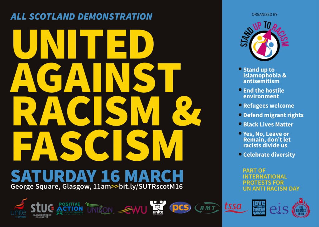 After the success of the Stand Up To Racism trade union conference, and counter demonstration opposing fascist ‘Tommy Robinson’ on 23 February, there’s less than three week’s to go to build the mass turn outs we need on the UN Anti Racism Day demonstrations, 16 March, in London, Glasgow and Cardiff. This is a day of international protest to get the voice of the anti racist majority out on the streets to drown out the divisive and dangerous hate being spread by a far right growing in confidence.