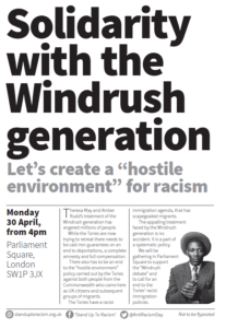 And on Saturday 5 May Stand Up To Racism has called the “March for Windrush” assembling 2pm at Downing Street details here