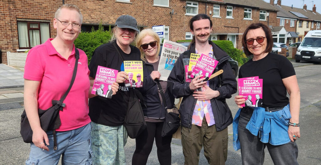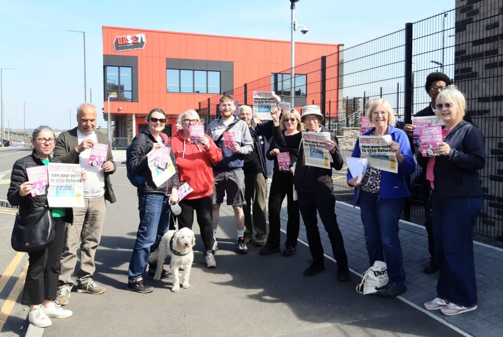 Bootle (Merseyside): Merseyside Stand Up To Racism and Women Against the Far Right were out campaigning against Reform UK in Bootle today. We were joined by activists from the PCS union. 16 people took part in a very successful leafletting session. The overwhelming response was very encouraging, with many people saying how glad they were that we were there.