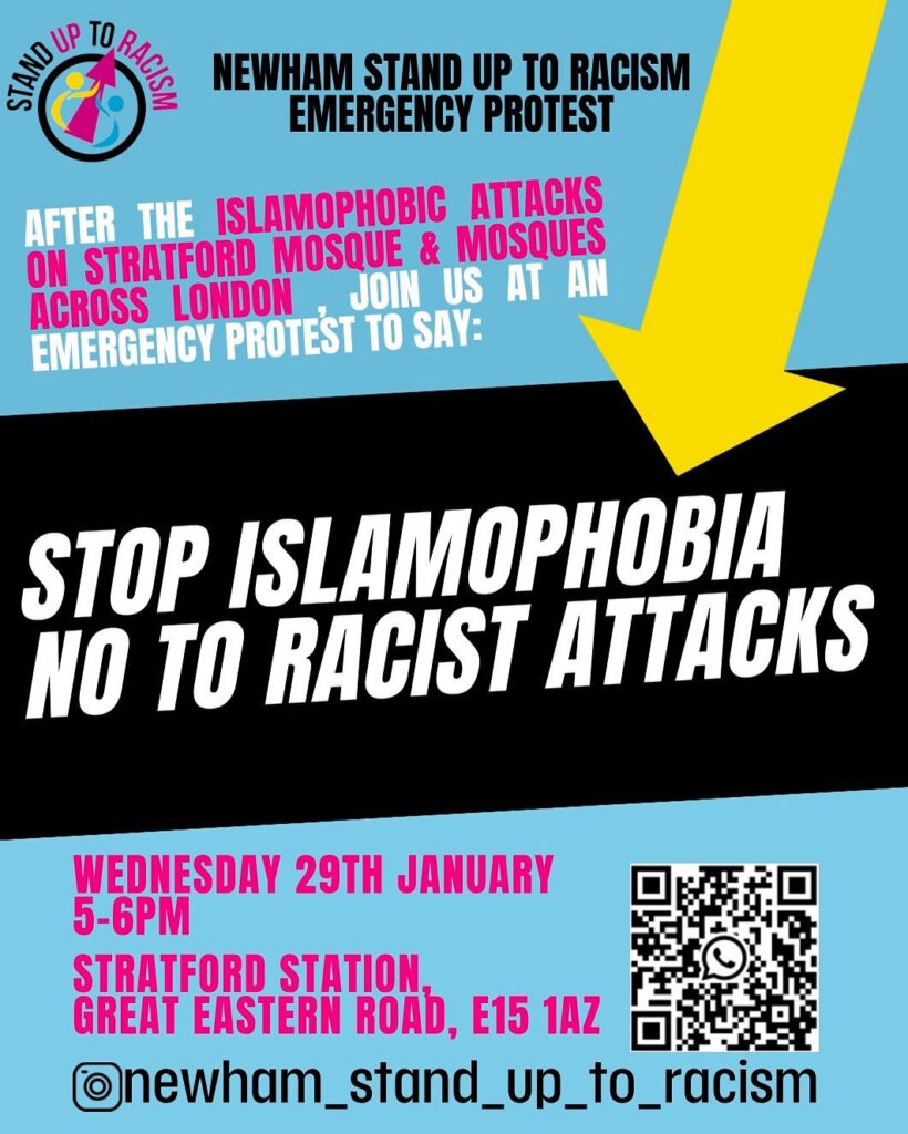 Following the Islamophobic attacks on Stratford mosque and other mosques across London, Newham Stand Up to Racism are calling an emergency protest outside Stratford Station to show that Newham stands against racism and that we will not stand for intimidation from the far right.