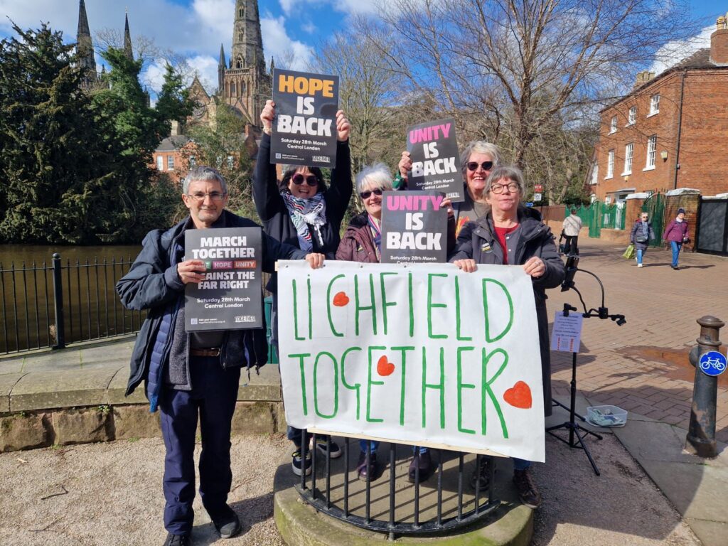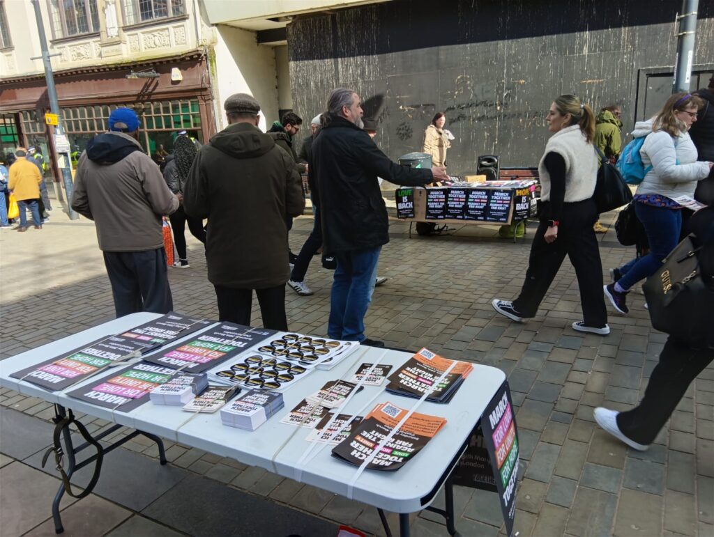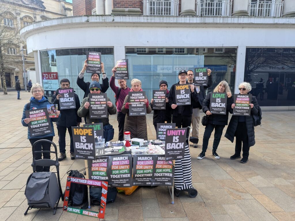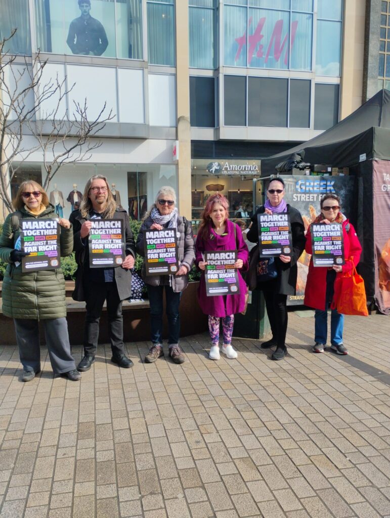 Today we gave out hundreds of leaflets for the Together demo on the 28th in Coventry city centre to help build the mass response we need and we also stopped a very weird and nasty group of hopeless fascists from ‘National Rebirth Party’ continuing their poxy little meeting at the Albany Theatre in Earlsdon (they’d booked it under a different name so we got the theatre to chuck them out). Excellent work organised via Coventry SUTR!