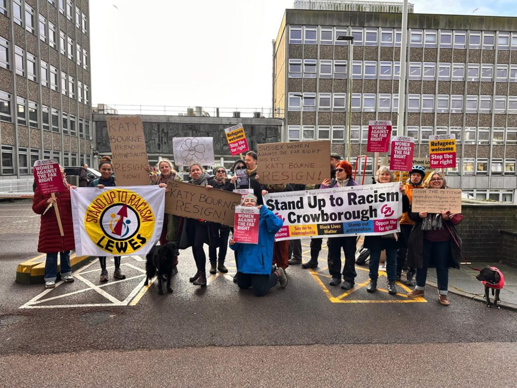 Community groups present outside and at the hearing including Sussex Women Against the Far Right, Stand Up to Racism Crowborough, Stand Up to Racism Newhaven, Stand up to Racism Lewes. These groups have gone a step further than the censure, calling for Bourne’s immediate resignation. They argue that her alignment with rhetoric targeting vulnerable groups is fundamentally incompatible with the integrity and impartiality required to oversee the Sussex Police force.