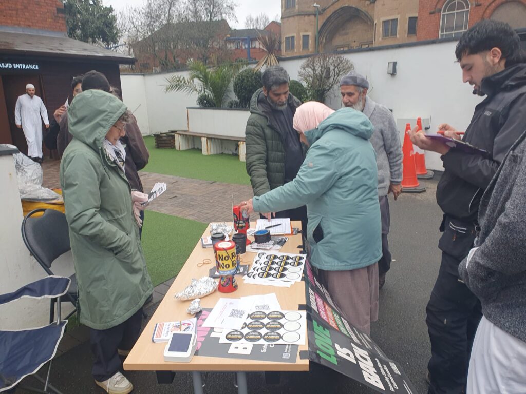 Nottm SUTR collection outside Masjid Al-Khazra mosque in Basford Nottingham to fund Together Alliance transport on 28th March. Fantastic response ( many had been on their regular Palestinian coaches to London). So friendly. 2 rounds of coffees and teas and also ‘wraps’ £733.38 collected – £326 on SUTR Sumup machine ( inc one £50 donation). £375 in notes and £32.38 in change. 300+ worshippers ( we ran out of our 320 flyers). So good in depth conversations. Looks like we could put on a coach from the mosque.
