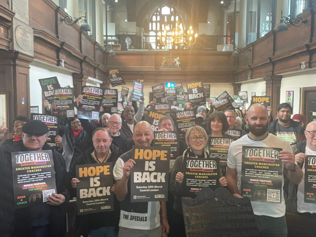 We then heard from our local MP Rebecca Long – Bailey and Salford Mayor, Paul Dennett about why we should come together to support The Together Aliiance against the far right.Local trade unionists, community campaigns,faith groups and migrant workers spoke about the importance of challenging division with love and hope.