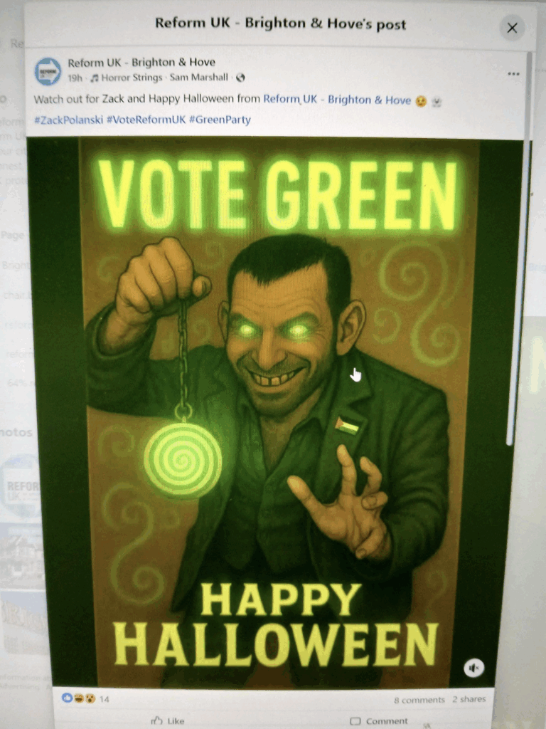 This blatant attempt to stir the pot isn’t the only disgusting incident involving Reform UK this weekend. Reform UK’s Brighton branch posted on Facebook (a post since deleted but shown here) a disgusting, antisemitic caricature of Green Party leader Zack Polanski, which echoed the Nazi propaganda of the 1930s.