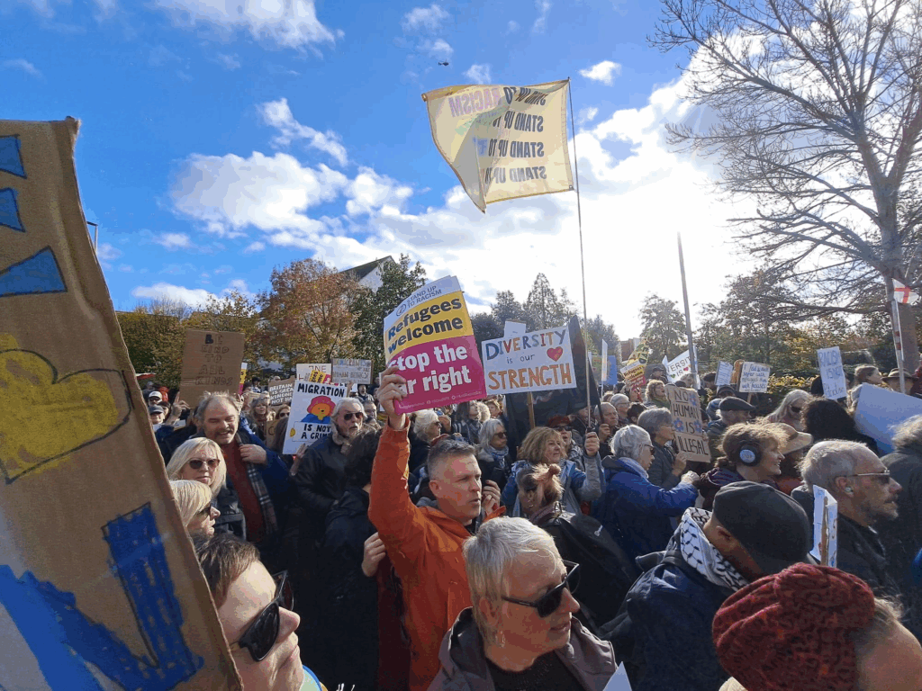 On Sunday 2nd November, anti-racists mobilised in Gloucester. Activists reported that “The far right had more flags than people. We outnumbered them by 250+ to 30ish. Some of the resident asylum seekers came out from the IBIS hotel to join our demo. Others made heart signs with their hands, gave thumbs up or waved. A good day for us and hopefully the flag wavers went home thoroughly demoralised.”