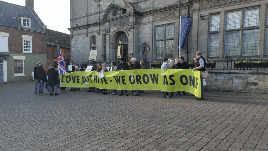A huge success In Oswestry on Saturday 1st. Activists reported that this was “The second time a protest has been called by the far right. And thanks to a wonderful group of local activists and the Oswestry Climate Hub countering it both times, yesterday only 2 turned up. From us there was some singing and a chance to network whilst giving out flyers to people passing by. A real demonstration that counter protests do work!”