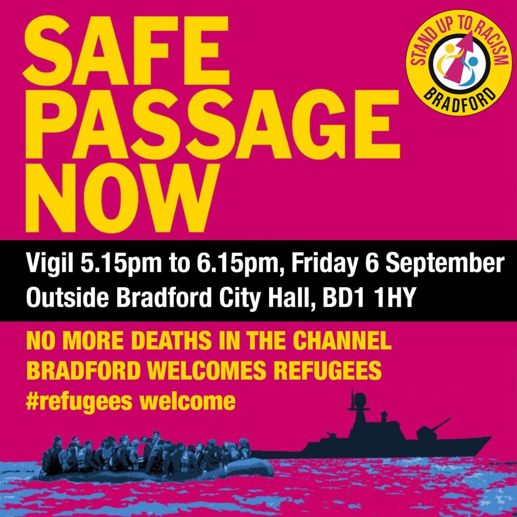 Bradford – Safe Passage Now! Vigil at Bradford City Hall BD1 1HY, 5:15 – 6:15pm 6th September