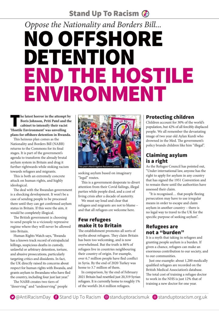 The NABA creates two tiers of “deserving” and “undeserving” people seeking asylum based on imaginary “legal” routes. This is a government desperate to divert attention from their Covid failings, illegal parties while people died, and a cost of living crisis after a decade of austerity. We must say loud and clear that refugees and migrants are not to blame – and that all refugees are welcome here.