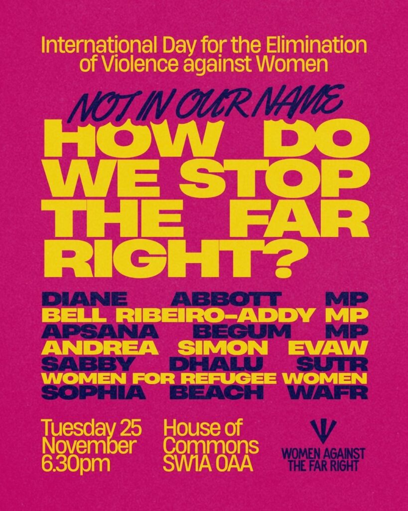 The far right is weaponising violence against women for their own racist agendas while claiming to be our protectors. Join this meeting on the International Day of Elimination of Violence Against Women to discuss how we stop the far right and tackle violence against women.