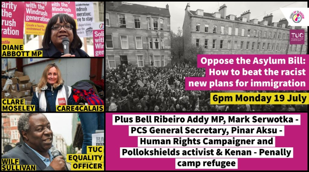 | 📢 OPPOSE THE ASYLUM BILL: HOW TO BEAT THE RACIST NEW PLANS FOR IMMIGRATION Online meeting, Mon 19 July, 6pm 📢 Join on Facebook livestream 👉https://www.facebook.com/StandUTR/live 📢 Join on Youtube livestream 👉 https://youtube.com/c/StandUpToRacismChannel/live 📢 Speakers include 🔥Diane Abbott MP // Bell Ribeiro Addy MP // Chris Stephens MP // Clare Moseley Care4Calais // Kenan ex Penally camp refugee // Aamer Anwar human rights lawyer // Pinar Aksu human rights campaigner, Glasgow, and leading activist in Pollokshields action that stopped dawn raid // Wilf Sullivan TUC Race Equality Officer // Mark Serwotka PCS general secretary // Julian Bild anti racist immigration lawyer & others 📢 Register  👉https://bit.ly/3wonBh2 📢 Join, invite, share on Facebook 👉https://fb.me/e/8EfNVRAAg |