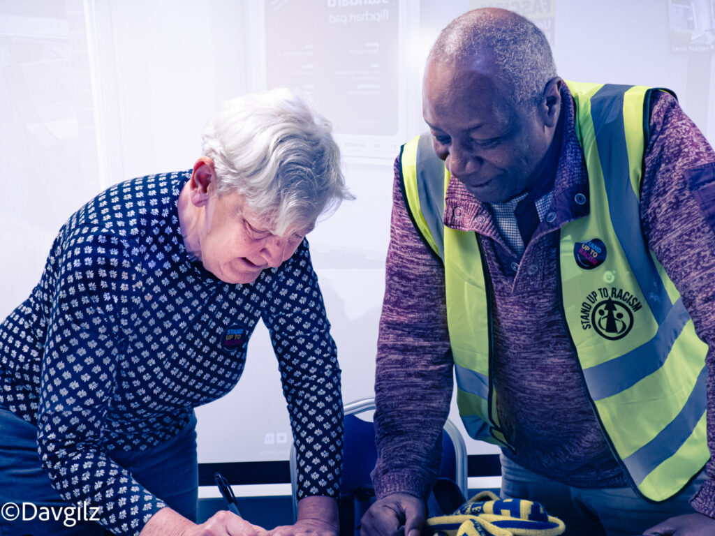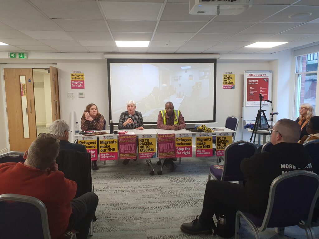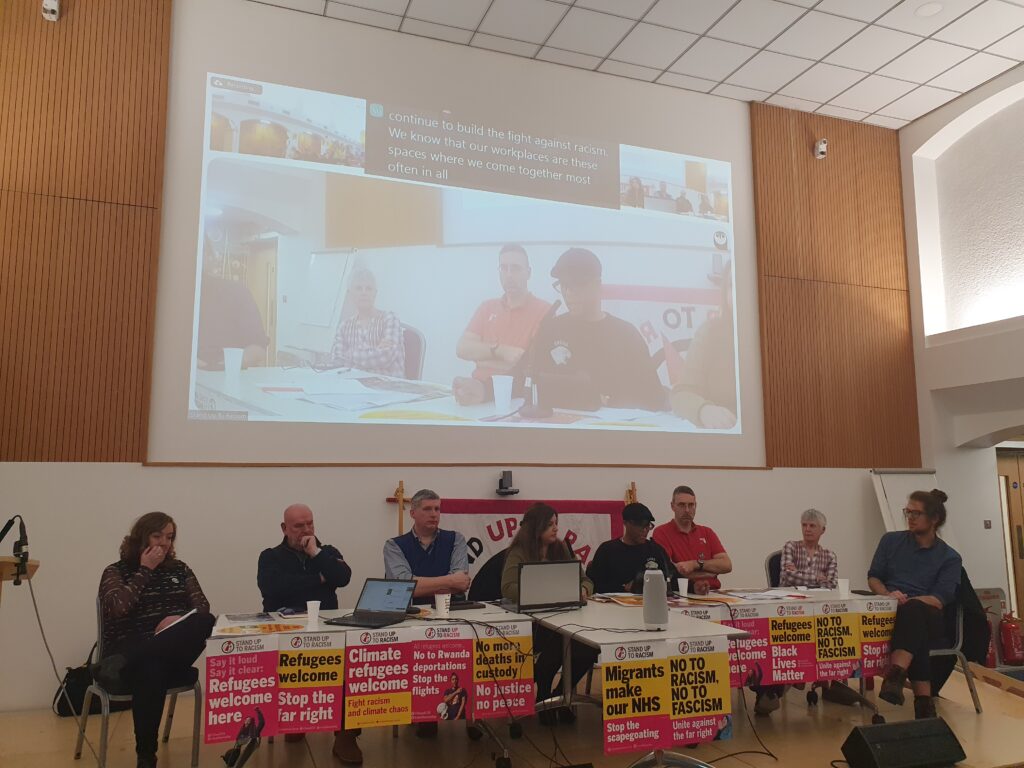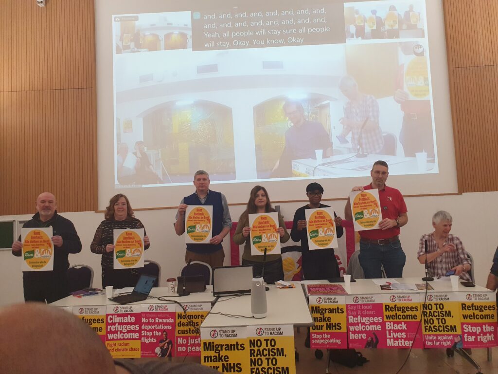 A workshop on Building Solidarity with Refugees and Migrant Workers was introduced by Fran Heathcote PCS general secretary, Kebba Manneh Unison National Black Workers Committee chair, Charlotte Khan Care4Calais, and Candy Udwin Dorset Stand Up To Racism & campaign against Bibby Stockholm Barge, hosted by Wilf Sullivan Stand Up To Racism national officer.