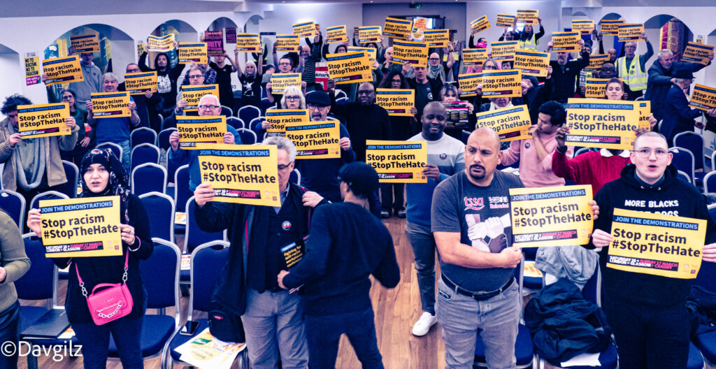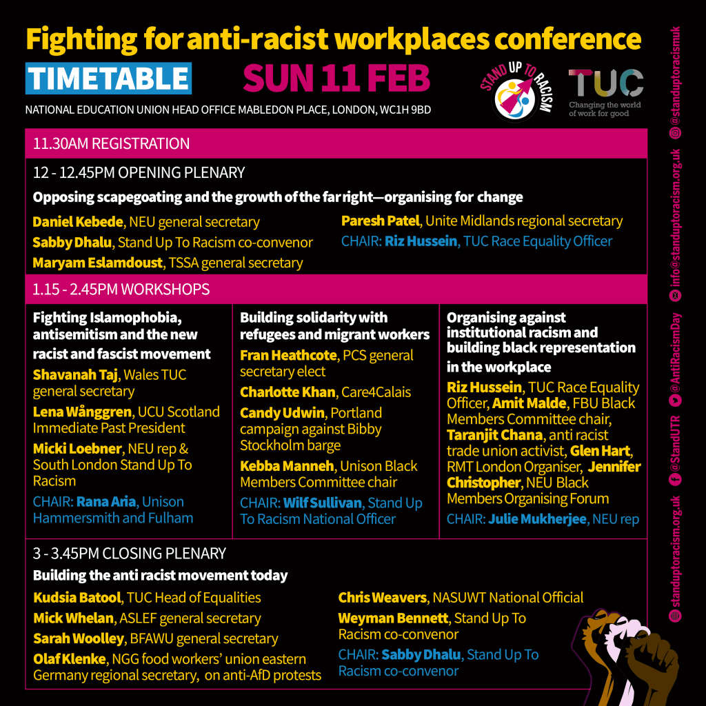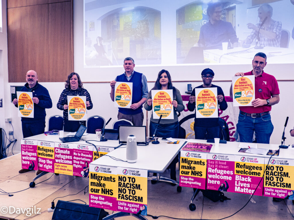 Mick Whelan ASLEF general secretary, France Heathcote PCS general secretary, Olaf Klenke NGG food workers union eastern Germany regional secretary who spoke about the mass anti fascist movement against the AfD, Chris Weavers NASUWT National Official, Brian Richardson Stand Up To Racism national officer and Sabby Dhalu Stand Up To Racism co convenor rounded off the event, with conference attendees chanting “Say it loud, say it clear, Refugees are Welcome Here” as they held up posters to say they are marching together against racism, Islamophobia and antisemitism on Saturday 16 March and Sunday 17 March, joining the global day of protest