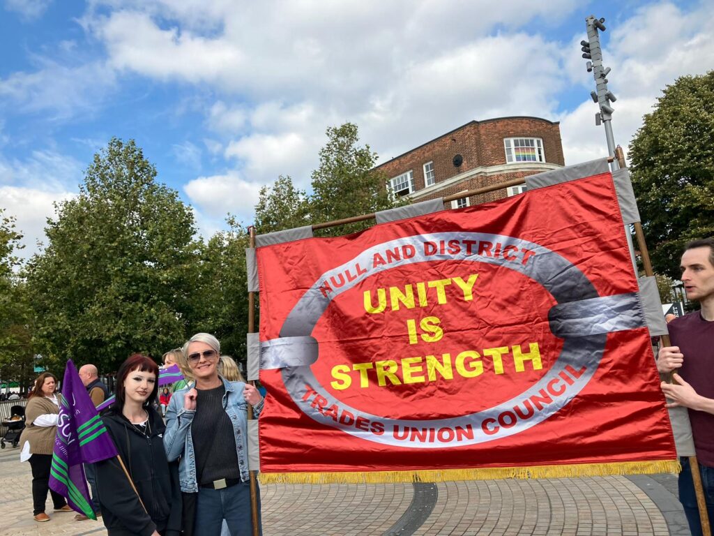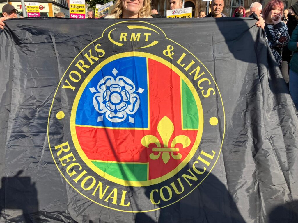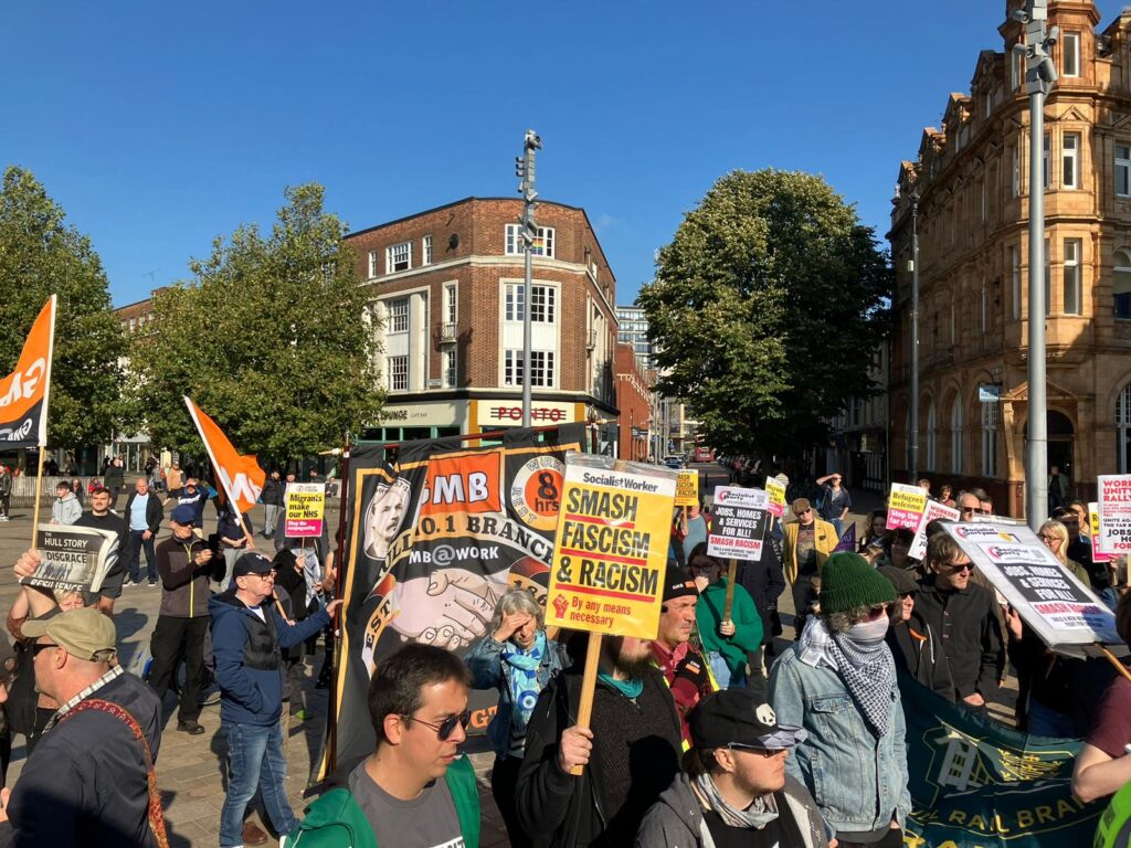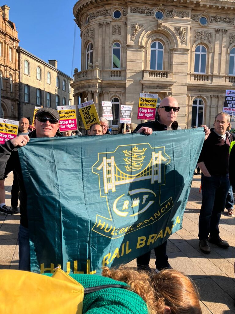Eleanor reports – Hull today (Saturday) unity rally against the far right. Lots of union banners and flags, including RMT, Unison and GMB. 250 of us, up to 50 racists.