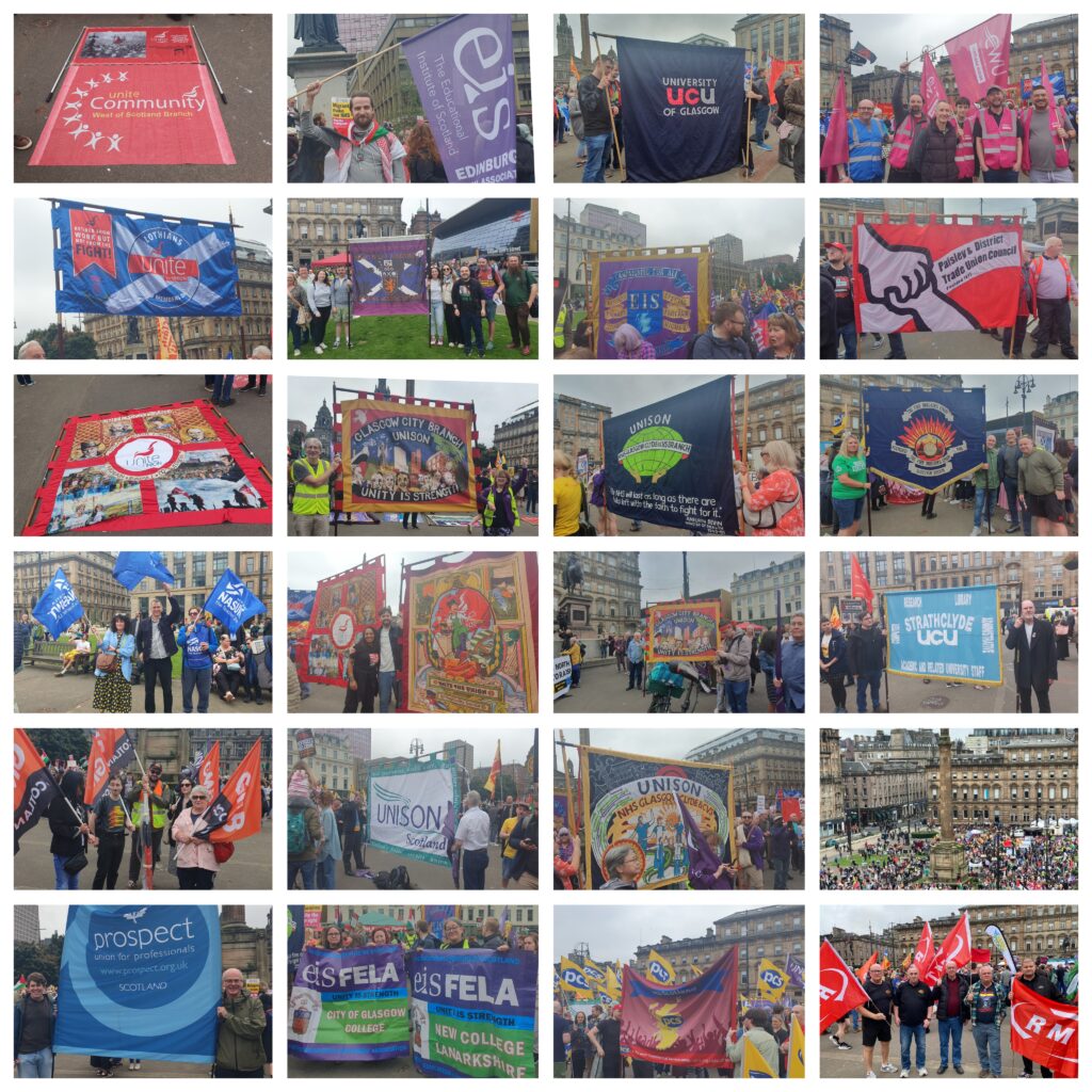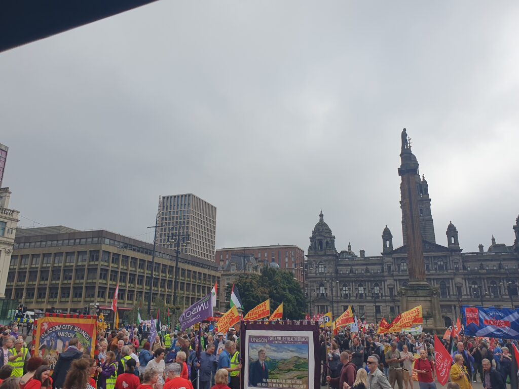 ![]() PRESS RELEASE – for immediate release, 7 September 2024 Stand Up To Racism protest in Glasgow backed by trade unions and celebrities outnumbers racists 10 to one George Sq, Glasgow CLICK HERE FOR PHOTO GALLERY Over 5,000 anti racists in Scotland showed that supporters of refugees are the majority in society, with a massive show of solidarity in response to a planned anti-immigration rally organised by the far-right who turned out less than 500. Five weeks ago, far-right figurehead fascist Tommy Robinson tweeted the Glasgow rally, organised by Stef Shaw aka the ‘Glasgow Cabbie’, with the message ‘the British are rising’. Those joining the Robinson-backed ‘rising’ could hardly hear their hate-filled speeches which were drowned out by speeches and chants from the antiracism rally. SUTR revealed Shaw’s links to antisemites, Holocaust deniers and individuals with a background of activism in Nazi and far right organisations. Shaw issued a statement in response – and then fell silent for 13 days, leaving followers on his Facebook page perplexed and wondering if the protest was still happening today. Shaw was a no-show at his own protest today, despite having launched a GoFundMe fundraiser towards the demo that people donated £2,400 towards. The display of unity from trade unionists, with a sea of banners and flags from more than ten different trade unions, interfaith organisations, Muslim and Jewish activists, refugee rights charities, pro-Palestine activists and antiracists from across Scotland shows there is mass opposition to the far-right and their violence. But when speaker after speaker had to emphasise the election results by Reform UK, a far-right and racist party, it underlines that this is only the beginning of a battle to root racism out of our communities. Talat Ahmed, SUTR Scotland convenor said: “Our rally was about celebrating and defending multiculturalism and diversity and saying loud and clear that refugees are welcome here and aren’t to blame for the problems in society. And that the far right, with their toxic politics of hate and division, are not welcome in Scotland. After Reform UK, a far-right party, achieved 7 percent of the vote in Scotland in the general election, and the chilling news this week that the AfD, a party with a neonazi wing, had a breakthrough in German state elections, we urge all to unite against the far-right, racism, Islamophobia and antisemitism.” Commenting on the rally Linda Somerville, STUC Deputy General Secretary, said: “We have long warned that the far-right poses a dangerous threat in the UK, spreading racist hate amongst communities that are often marginalised and under-resourced. The cruel impacts of austerity, compounded by the drip feed of anti-migrant rhetoric from parts of the media and some politicians has created these conditions. Trade unions have a long history of defending our communities against fascists and racists and proudly joined the rally in Glasgow to show racists that they have no place here.” Sabir Zazai. Scottish Refugee Council CEO, said “As a refugee charity, we are no strangers to messages of hate from the far-right. But these are always overwhelmingly out-numbered by a huge amount of support from across Scotland. We were in George Square on Saturday to make it clear that refugees are welcome here” Weyman Bennett, Stand Up To Racism national co convenor, added “Glasgow was a fantastic show of unity in action, outnumbering the racists, far right and fascist forces today 10 to one. “Over the past month, the anti racist movement has truly kicked the arses of the far right movement up and down Britain, and in Belfast in Ireland. Thousands upon thousands joined Stand Up To Racism protests in Britain, turning out in defiance to claim the streets instead for the anti racist majority and break the attempt by fascists and the far right to take our communities for their hateful narrative of division and their violence towards refugees, migrants and Muslims. “Less than a month since racists and fascists set fire to a hotel housing refugees with human beings – our neighbours – in the building, we had the horrific news of more needless and avoidable deaths in the Channel. “Government politicians over recent years have driven scapegoating racist rhetoric and policies demonising and dehumanising refugees. “So it is no wonder in this manufactured climate that we have seen first the breakthrough of the racist Reform UK party, and then the largest mobilisation of fascist Tommy Robinson and his far right racist thugs since we stopped his movement on the terraces and on the streets in 2018/19. And in the wake of some 15,000 joining a mobilisation called by Nazi Robinson, we saw outright racist lies by fascists and the far right go viral in the wake of the Southport murders. “This all led directly to violent racist riots and the burning of refugee accomodation across Britain. “Stand Up To Racism with the support of trade unions, a spread of politicians, faith organisations, artists and cultural figures, and campaigners moved quickly to turn the tide, calling anti racist counter demonstrations that turned out tens of thousands to make clear that racists and the far right will not be allowed to claim our streets and terrorise refugees and Muslims. “In this climate, our hearts break to hear of the deaths in the Channel – when as human beings we should be welcoming with open arms all those with the courage and resolve to embark on these unnecessarily treacherous journeys for a better life. They are heros – not demons. “So our resolve hardens too – we demand safe passage now, and we demand refugees are welcome here. “We are continuing to build the mass movement that will turn out every time the far right, racists and fascists seek to exploit and divide our communities. That’s what we did in Glasgow today and we call on all who can to join us, and stand up together in our lou
