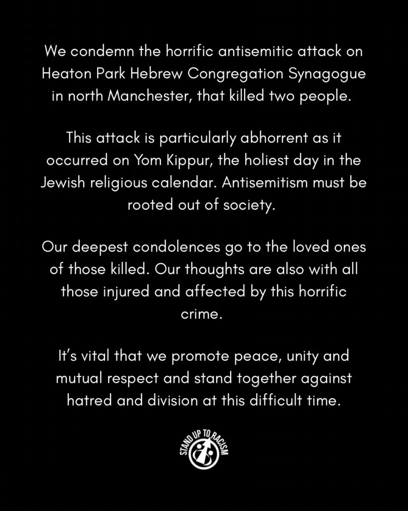 We condemn the horrific antisemitic attack on Heaton Park Hebrew Congregation Synagogue in north Manchester, that killed two people.