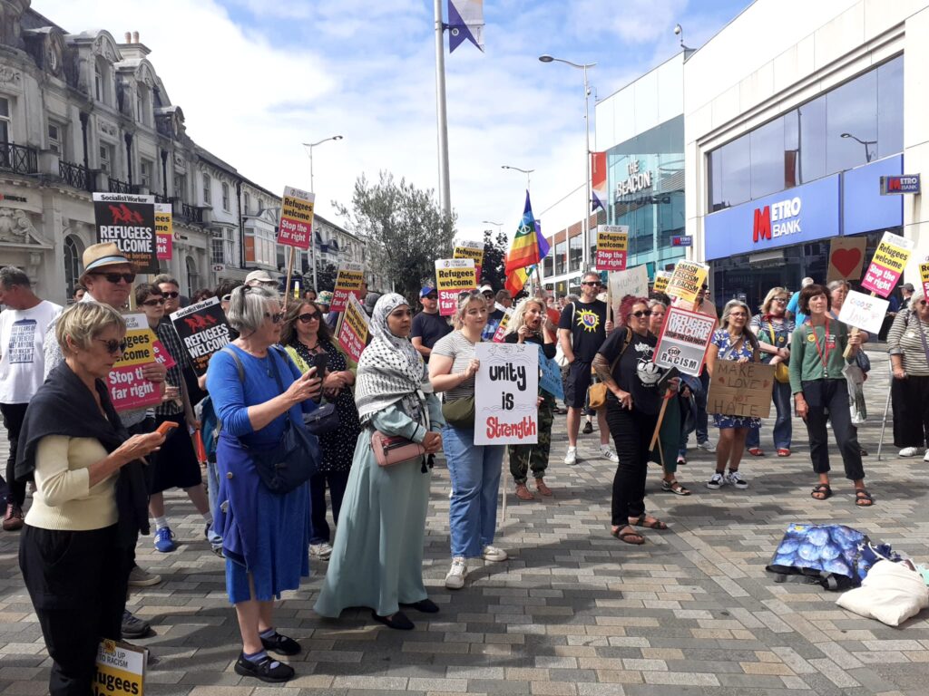 150 at Eastbourne. Great range of speakers and poets plus a great set from a local internationalist Roma jazz band who played a great rendition of Bella Ciao. Chants of ‘Eastbourne, Eastbourne say it clear! Racists are not welcome here’. We put the unity in community ✊✊🏽✊🏿