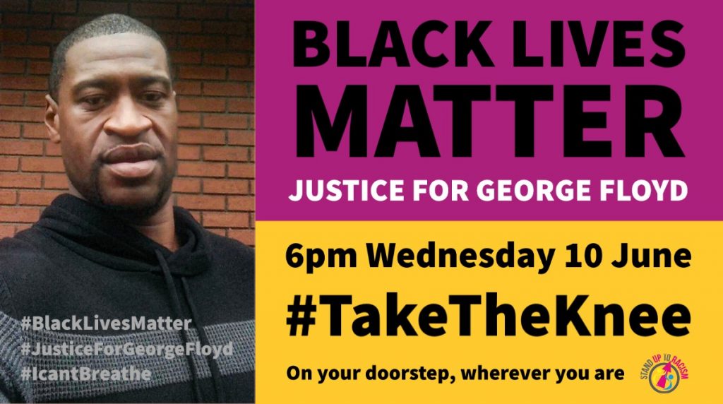 | #TAKETHEKNEE – NEXT ACTIONS AFTER THOUSANDS JOINED PROTEST ON DOORSTEPS & IN COMMUNITIES A picture gallery of actions across the country can be found here. These pictures and those at twitter.com/antiracismday can be used with credit to Stand Up To Racism – List of local actions can be found here – Further actions planned for weekend with socially distanced protests on Saturday and online rally Sunday 6pm – Press coverage included ITV and Channel Five national news, the Independent, regional BBC coverage, The Mirror, Evening Standard, The Metro, The Herald, amongst others. NEXT ACTIONS – Sat 6 June Day Of Action: Say Their Names – Black Lives Matter – Sun 7 June Mass Online Rally: Black Lives Matter – We Demand Change, 6pm – Wed 10 June Weekly #TakeTheKnee event, 6pm, on your doorstep, wherever you are At 6pm on Wednesday 3 June, tens of thousands joined Stand up to Racism’s call for people to “take the knee” on their doorsteps to say Black Lives Matter and demand justice for George Floyd. Over 25 thousand tweets used the hashtag #taketheknee, with many posting pictures of their households and workplaces with home made signs. #TakeTheKnee trended number one on Twitter, and following its success #TakeTheKnee is now going to be a weekly event every Wednesday 6pm. Those taking part yesterday included The Fire Brigade service, with many watches joining together to take the knee outside their fire station. Singers Paloma Faith and Bronnie also tweeted to show their support for the action. The day of action also saw local Stand Up To Racism groups hold strictly socially distanced protests to express solidarity with the movement for justice for George Floyd, and to raise the call for an independent public inquiry into the disproportionate BAME deaths due to Covid-19. The action to take the knee is inspired by American quarterback Colin Kaepernick bending to one knee during the National Anthem in 2016 to draw attention to racial injustice and police brutality, and expresses solidarity with the movement in Minneapolis, across the US and around the world, with thousands protesting their anger at institutionalised racism and police brutality here in Britain. Campaigners hope that the thousands joining in with yesterday’s protest are inspired to join urgent campaigns to address institutional racism, including in Britain the disproportionate impactof Covid-19, and the fact that BAME communities are 54 per cent more likely to be fined under coronavirus rules. Police brutality is also a pressing concern in the UK as the recent tasering by police of Desmond Ziggy Mombeyarara in Greater Manchester shows. An independent public inquiry into the disproportionate impact of Covid-19 on BAME communities is a central demand of many, and Diane Abbott MP has submitted an Early Day Motion in the House of Commons to that effect. Concerns have also been raised about the premature easing of the lockdown leading to a second wave of coronavirus infections, which could further disproportionately impact on BAME communities. Click here to JOIN Stand Up To Racism – more than ever we need a strong, united and fighting anti racist movement to end the hostile environment and take on institutional racism. Click here to DONATE to our work, and keep the anti-racist movement going at this crucial time |