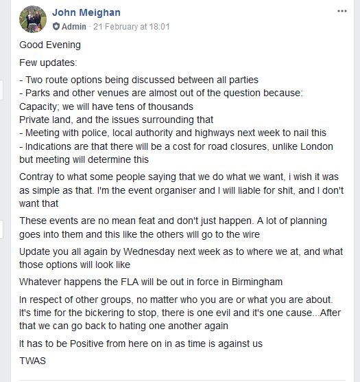 The Football Lads Alliance (FLA) are to march in Birmingham, next month. However, all is not going as well as they would wish, as founder, John Meighan admits, below.