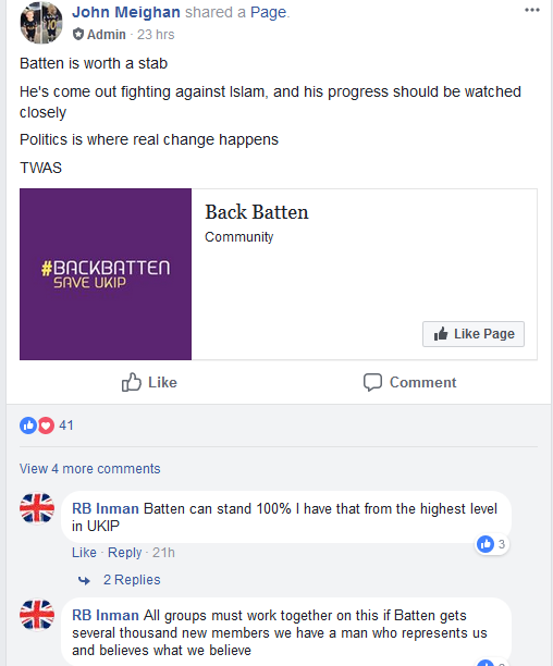 Meighan (and VAT leader, Inman) has thrown his lot in with UKIP the openly islamophobic rump, who are currently led by Gerald Batten.