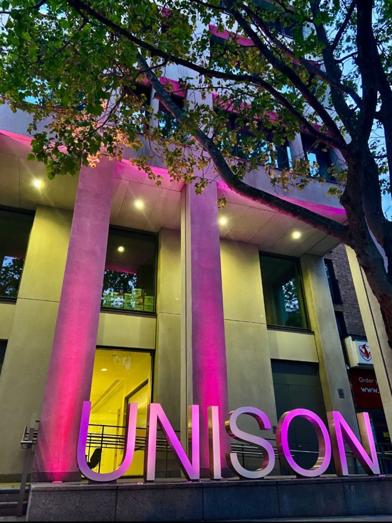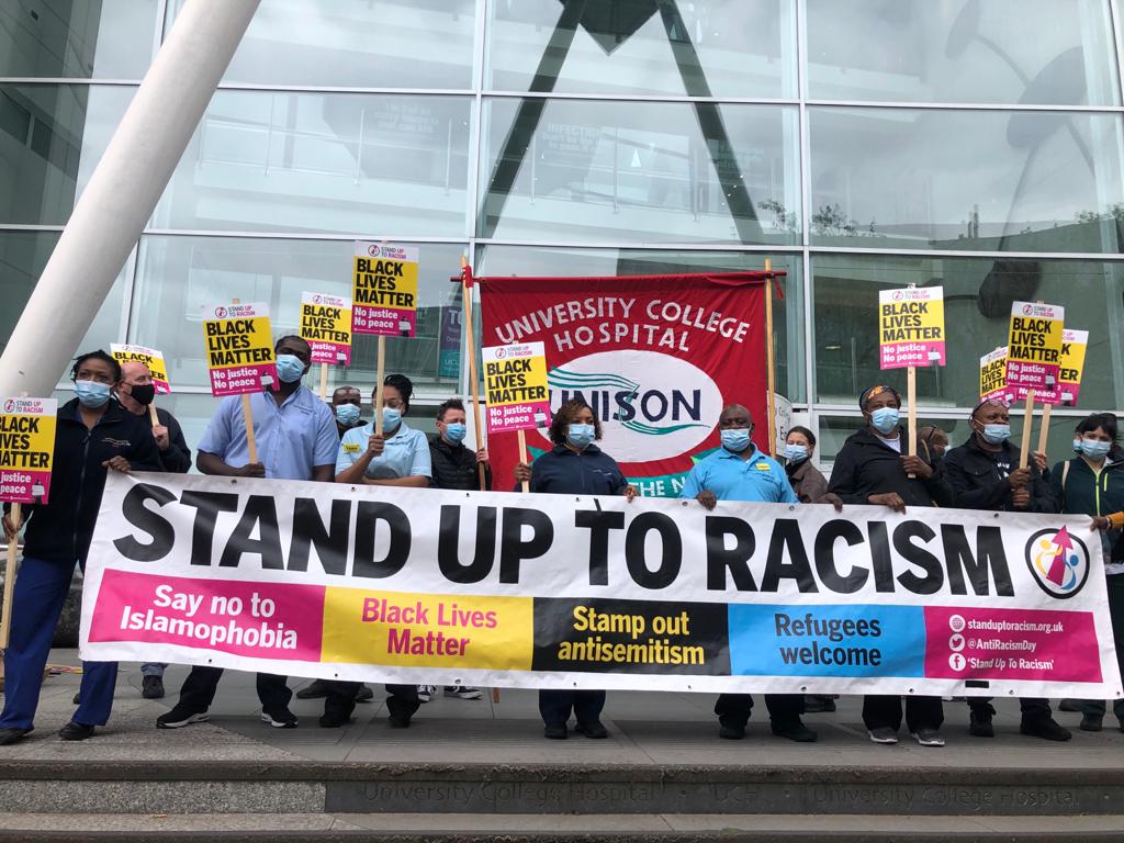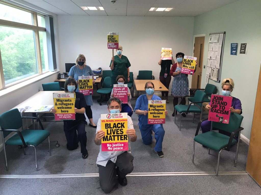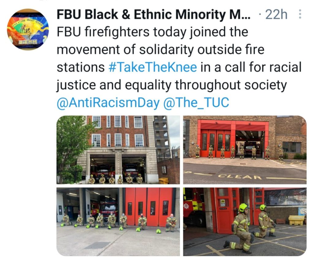 The TUC call saw powerful #TakeTheKnee action across firestations by Fire Brigade Union (FBU), and #TakeTheKnee by National Education Union (NEU), Educational Insitute Scotland (EIS) & University College Union (UCU) in schools and colleges. NHS workers cane to #TakeTheKnee outside hospitals to highlight disproportionate deaths in covid. There was a brillant show from Unison with actions across councils and the health service, and the HQ light up. Other fantastic support from unions included the Public & Commercial Services union (PCS), Rail Maritime & Transport union (RMT), GMB, the Transport Salaried Staff Association (TSSA), ASLEF, the National Union of Journalists (NUJ), Musicians Union (MU) and many #TakeTheKnee workplace actions in hospitals by the Chartered Society of Physiologists (CSP), and many more.